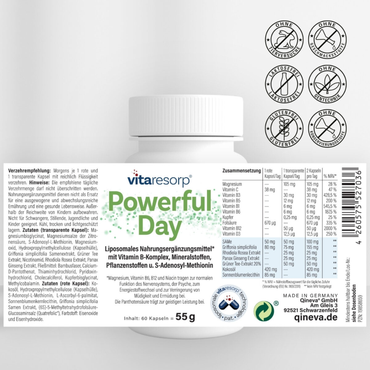 Die innovative liposomale Rezeptur vereint einen hochwertigen Vitamin-B-Komplex, Magnesium und ausgesuchte Pflanzenextrakte wie Ginseng, Rhodiola, Grüntee und Griffonia. Die enthaltenen B-Vitamine und Magnesium tragen zu einem normalen Energiestoffwechsel bei (1) und helfen dabei, Müdigkeit und Ermüdung zu verringern (2). Außerdem unterstützen sie die normale Funktion des Nervensystems (3) und fördern die geistige Leistung (4). Magnesium trägt zusätzlich zur normalen Muskelfunktion bei (5).